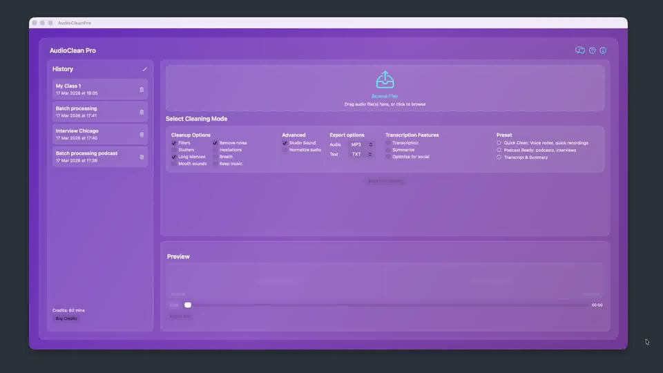 For podcast and voiceover workflows on Mac, AudioClean Pro goes further than Adobe Enhance: it removes filler words and long silences, generates automated podcast show notes, and uses a privacy-focused approach where your audio is processed on secure servers and automatically deleted after the job. There's no subscription lock-in—just credits you pay for when you need them.
